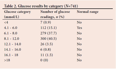 Hypoglycaemia, defined at the time of the study as a glucose value of <4.0 mmol/L, was observed in 7 (0.9%) readings. Interestingly, had the results been analysed using the currently employed glucose control protocol, 279 (37.7%) readings would have been within the target range, which is presently defined as 6.1 - 8.0 mmol/L.