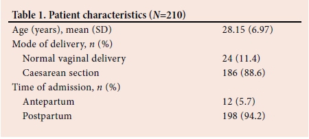 A total of 248 obstetric patients were admitted during the study period, of whom 210 had complete medical records. Fifteen percent (n=38) of the patients were excluded from the study due to incomplete records. The demographic characteristics of the participants are shown in Table 1. The mean age was 28.15 (standard deviation (SD) 6.97) years. Twelve (5.7%) patients were admitted at a mean (SD) gestational age of 25.33 (6.56), 94.2% (n=198) were postpartum, and 88.6% (n=186) were post-caesarean section.