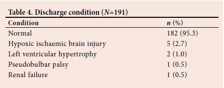 Eighteen (8.6%) women had an associated medical illness, other than cardiac, prior to pregnancy, with HIV infection being the most common (7.1%; n=15), followed by epilepsy. Sixty-one percent (n=128) of patients received ventilatory support, for a median (range) period of 1 (1 - 13) day. The median length of ICU stay was 24 hours (range 1 - 17 days). Eighty-seven percent (n=183) of the patients were haemodynamically stable. Maternal mortality was 9% (n=19). The major cause of death was intracerebral haemorrhage (36.8%; n=7), followed by cardiogenic shock (26.3%; n=5) (Table 3). A total of 191 (90.6%) patients were discharged, of whom 182 (95.3%) were in a stable condition. Five patients suffered hypoxic ischaemic brain injury, two had left ventricular hypertrophy, one developed pseudobulbar palsy, and the other suffered renal failure. Hypoxia developed as a result of difficult intubation in the operating room (n=2) and convulsions in eclampsia (n=3). Hypoxic ischaemic brain injury had been confirmed by computed tomography scans. All five patients were discharged with a tracheostomy mask. The patient who developed renal failure had to be dialysed (Table 4).