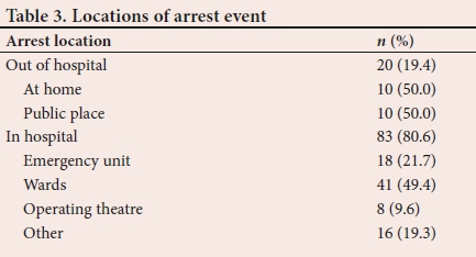IHCA occurred in 83 (80.6%) of the patients, whereas OHCA was documented in 20 (19.4%) cases (Table 3). 'Other' IHCA events included six (7.2%) cases that occurred during interhospital transfer in the ambulance.
