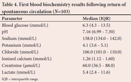 The first blood chemistry results after the arrest and ROSC are presented in Table 4.