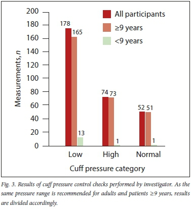 Paediatric patients were divided into two age groups (<9 years and >9 years) owing to differences in recommended CP ranges. The range used for the purpose of the study was 25 - 30 cmH2O for patients >9 years and 20 - 25 cmH2O for patients <9 years.[10,11] All data were anonymised prior to analysis.