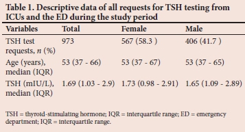 All requests for TSH testing in patients older than 18 years who presented to the emergency department or were admitted to the medical, cardiac or surgical ICU or the medical high-care unit during the study period were included in the analysis. Patient data were collected from the NHLS laboratory information system (LabTrak). The information system was also used to determine whether cases of NTIS were followed up by repeat testing after 6 - 8 weeks. Clinical information required to determine the indication for TSH testing was obtained from the electronic patient record system of the hospital. Data collected included patient demographics, medication at index presentation and final clinical diagnosis.