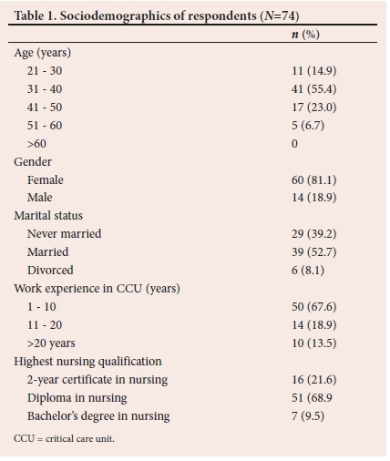 A total of 74 CCNs completed the questionnaire (100% response rate). More than half of the respondents fell within the age range of 31 - 40 years (55.4%; n=41). The majority of the respondents (81.1%; n=60) were female and 18.9% (n=14) were male. Thirty-nine (52.7%) respondents were married. More than half of the respondents had 1 - 10 years' work experience in CCUs (67.6%; n=50). Most of the respondents (68.9%; n=51) had a diploma in nursing (Table 1).