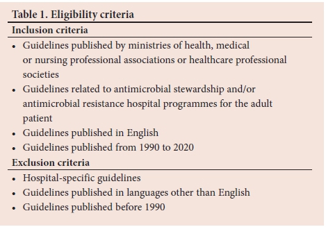 METHODS. Scoping review methodology was used to systematically search published and 'grey' literature in PubMed, EBSCOhost, Google Scholar, government websites and websites of professional societies and organisations. Search dates were from 1990 to 2020. Inclusion criteria were English language AMS guidelines for hospitals.