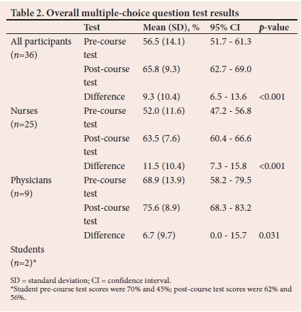 Most participants (85.6%) had a higher test score after completion of the course. Physicians had both higher pre- and post-course MCQ test scores when compared with that of non-physician participants. While nurses and physicians both improved their overall scores significantly after completion of the course, there was no difference in the magnitude of improvement between the two groups (difference (SD)=3.9 (4.2)%, p-value=0.626) (Table 2).