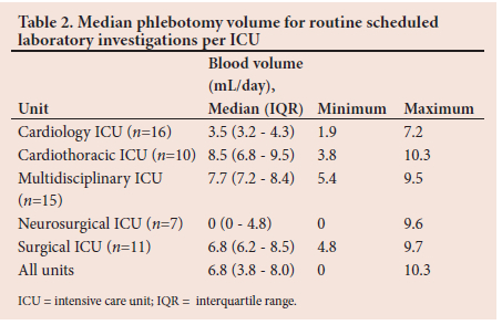 RESULTS. Data from 59 participants with a median length of stay at the ICU of 3 days were analysed. The median phlebotomy volume was 7.0 mL day and 13.6 mL/ICU admission. The volume of blood required for analysis daily and ICU admission was 0.7 mL and 2.2 mL, respectively. The median phlebotomy volume in excess of the amount required for analysis daily and ICU admission was 5.05 mL and 12.11 mL, respectively.