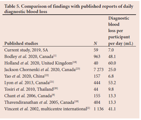 While these volumes may seem to be insignificant, it has been shown that median (IQR) blood volumes of as little as 3.5 (2.4 - 6.8) mL/day drawn in excess may double the odds of being transfused after 21 days in ICU.[9] The association between diagnostic phlebotomy and transfusion has been reported by an extensive multicentre study that included 7 273 patients.[23] Furthermore, other studies have shown that diagnostic testing contributes to ICU-acquired anaemia.[1,9,18-20]