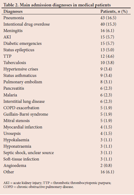 This study contributes to the body of literature by describing the epidemiology and mortality of critically ill medical adults in an SA hospital. Infectious diseases remain a major cause of ICU admission and the presence of sepsis and AKI were independent markers of mortality. A high HIV seroprevalence with a low uptake of ART were found in this cohort. However, despite low ART uptake, HIV-positive status was not independently associated with mortality.