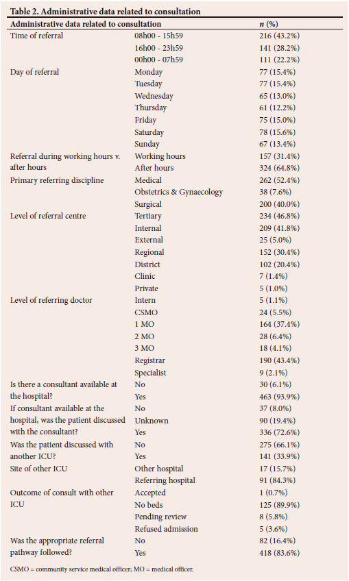 RESULTS: Five hundred consultations were reviewed over a 6-month period; 52.2% of patients were male and the mean age was 44 years. Junior medical officers referred 164 (32.8%) of the consultations. Although specialist supervision was available in 459 cases, it was only utilised in 339 (73.9%) of these cases. Most referrals were from tertiary (46.8%) or regional (30.4%) hospitals; however, direct referrals from district hospitals and clinics accounted for 20.4% and 1.4% of consultations, respectively. The appropriate referral pathway was not followed in 81 (16.2%) consultations. Forty-five percent of consults were accepted; however, 9.3% of these patients died before arrival in ICU. A total of 151 (30.2%) patients were refused ICU admission, with the majority (57%) of these owing to futility. Patients were unstable at the time of consult in 53.2% of referrals and 34.4% of consults had missing data