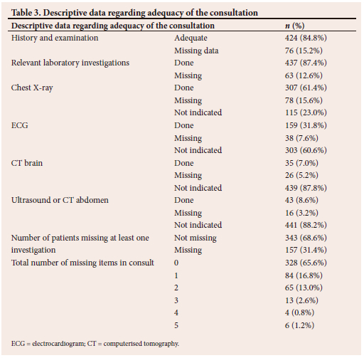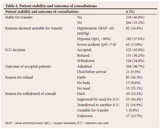 When evaluating the adequacy of a consult, two key metrics were explored. One was whether the necessary data were available during the consult for the ICU team to make an appropriate decision on ICU admission, and the second was whether the patient would have been stable for transfer to the referral ICU if accepted. The adequacy of the data contained on the consult form was assessed by the principal investigator (UVJ) using a standard format analysing clinical data and special investigations. Clinical data were deemed adequate if the basic history and examination areas on the consult proforma had been completed. Special investigations were noted to have been 'done' if the results of these were included in the dedicated areas on the consult proforma, 'not indicated' if the investigation was not necessary for the specific consultation, and 'missing' if the investigation was indicated but the results were not recorded. Any doubts as to the adequacy of clinical data and appropriateness of investigations were resolved by consensus after discussion with a senior intensivist (KdV). No established criteria exist to determine whether a patient is stable for transfer. Patients were deemed unstable for transfer if the patient had any one of the following: a mean arterial pressure (MAP) <65 mmHg, SpO2 <90%, or pH <7.0 on arterial blood gas. These criteria were based on clinical criteria proposed by senior intensivists in the study ICU. While individual patients may have been transferred despite values falling outside the range listed above, these were the initial targets recommended by the unit intensivists.