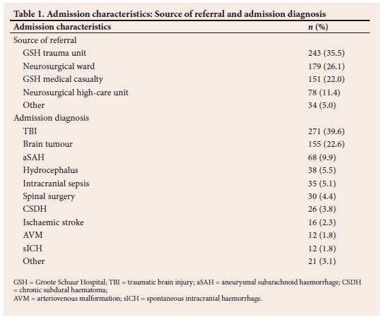 BACKGROUND. At Groote Schuur Hospital (GSH), the neurosurgical intensive care unit (NsICU) is a 6-bed unit headed by a specialist neurosurgeon with extensive experience in neurocritical care, working in close collaboration with intensivists from the Division of Critical Care. There is currently no detailed analysis of the demographics, diagnosis and management of patients admitted to the NsICU at GSH.