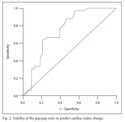 Table 3 provides the predictive characteristics of ∆PCO2 and gap/gap ratio. The optimal threshold values are also provided.