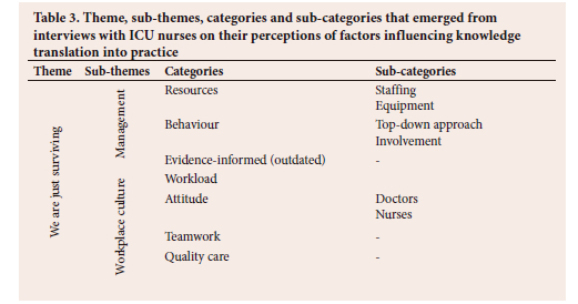 Participants were overwhelmed by an unrealistic workload, staff shortages, inadequate equipment, outdated protocols and the current status quo in the intensive care working environment. Participants felt adrift and unsupported in providing quality nursing care to ICU patients. They also felt as if they were merely surviving, providing essential care to prevent complications with critically ill patients. Participants highlighted their workplace culture as unsupportive and hostile, which hindered their ability to translate their knowledge into practice. Participants indicated that some doctors and colleagues had negative attitudes and were barriers to the translation of knowledge. These are some quotes of participants: