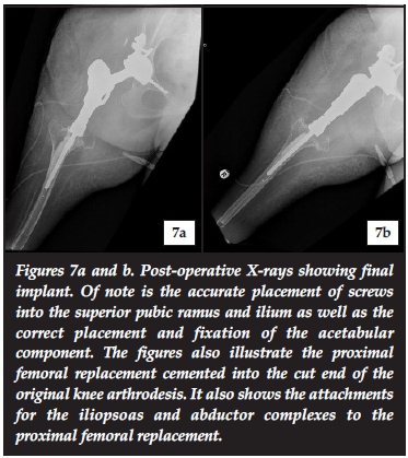 The surgery was performed with the patient bolstered in the lateral position and a lateral approach was used to gain access to the hip joint. After removal of existing hardware and the proximal femur, the novel acetabulum was created using the premade reaming jigs. The acetabular component was fitted into this structure using screws accurately placed by the customised drill guide (Figures 7a and b, and Figure 8). An Avantage dual-mobility cup was cemented into the acetabular component and a proximal femur replacement (LRS Implants, Cape Town) was performed with repair of the soft tissues.7