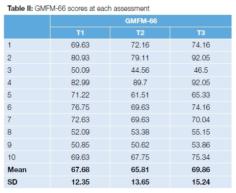 A summary of the GMFM-66 scores can be seen in Table II. The GMFM-66 scores ranged from 44.56 to 92.05 over the three assessments. There was a 1.87 (2.77%) decrease in the mean GMFM-66 scores at T2. There was, however, an overall mean improvement of 2.18 (3.23%) from T1 to T3. In six patients the GMFM-66 scores improved between T1 and T3, and four scores decreased (one of these was HIV positive). The changes seen in the GMFM-66 were clinically significant as the reported MCID for the GMFM-66 is 1.5.21