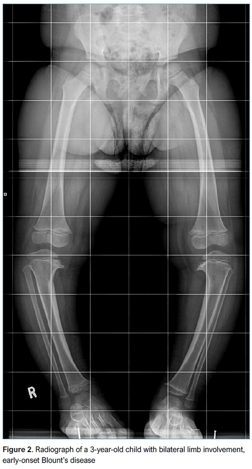 Blount's disease is a developmental condition characterised by disordered endochondral ossification of the medial part of the proximal tibial growth plate resulting in multi-planar deformities of the lower limb.1,2 Secondary to the asymmetrical growth with relative inhibition of the posteromedial portion of the proximal tibial growth plate, a three-dimensional deformity of the tibia develops with varus, procurvatum (apex anterior), and internal rotation along with possible limb shortening in unilateral cases.1,2 This entity can lead to a progressive deformity with gait abnormalities, limb-length discrepancy, and premature arthritis of the knee.1,2 Blount's disease is classified into early-onset (infantile) and late-onset based on whether the limb deformity develops before or after the age of four years.2-4 It is classified radiologically by Langenskiold into six progressive stages per severity of the deformity to help in prognosticating patients' outcome.4-7 The incidence of Blount's disease in South Africa was estimated to be 0.03% three decades ago.8