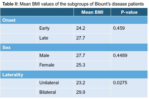 There was no association between laterality and onset of Blount's disease (early vs late) with Pearson chi-squared = 0.22 with p-value = 0.64 and Fisher's exact = 0.72. There was a statistically significant difference between the mean BMI of patients with unilateral disease 23.2 kg/m2 (range: 12-40) and bilateral disease 29.9 kg/m2 (range 13-44) with p-value = 0.0275). The mean BMI for the control group was 20.2 kg/m2 (range: 12-36). There was a statistically significant difference between the mean BMI of Blount's disease patients and the control group (p-value = 0.0005).