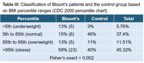 Table III presents a comparison of BMI% between Blount's disease patients and the control group based on the CDC criteria for children (Fisher's exact = 0.002). Five (56%) of nine children with early-onset Blount's disease and 18 (60%) of 30 patients with late-onset Blount's disease were classified as obese (Fisher's exact = 0.459). Five (17%) of the 30 patients with late-onset Blount's disease and none of nine patients with early-onset Blount's disease were classified as overweight.