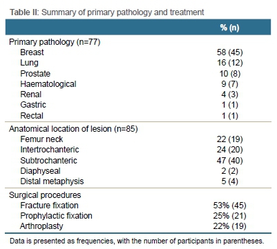 RESULTS: Eighty-five femurs in 77 patients were included (mean age 61 years, range 20-90). Lesions were located in the femoral neck (19/85, 22%), intertrochanteric (20/85, 24%), subtrochanteric (40/85, 47%), diaphyseal (2/85, 2%) and metaphyseal/per-condylar (4/85, 5%) regions of the femur. A total of 64/85 (753%) procedures were performed for fractures and 21/85 (25%) prophylactically. Eighteen of the 85 (21%) underwent long-stemmed cemented bipolar hemiarthroplasty, 1/85 (1%) long-stemmed cemented total hip replacement (THR), 62/85 (73%) cephalomedullary nailing, and 4/85 (5%) retrograde femoral intramedullary nailing. Mean follow-up was eight months (range 1-36). There were no dislocations or periprosthetic fractures in the arthroplasty group. One failure (1/66, 2%) of fixation occurred in the intramedullary nailing group. Six deaths occurred in the arthroplasty group (6/64, 9%) and 24 in the nailing group (24/66, 36%) during the study period. Four patients suffered from thromboembolic phenomena (4/77, 5%). Of the 13 patients who sustained a pathological fracture and were managed with intramedullary nailing and followed up for at least one year, all had achieved clinical and radiological union
