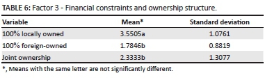 Lastly, the ANOVA results revealed that respondents also differed in their perception of factor 3 (financial constraints) depending on the ownership structure of the enterprise, in that locally owned enterprises scored statistically significantly higher (p < 0.05; see Table 6) for financial constraints than foreign-owned enterprises and jointly owned enterprises.