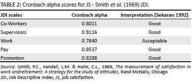 Research conducted by Kinicki et al. (2002:25-26) stated that the JDI instrument had shown internal consistency and reliability estimates that were moderately high, whilst Fisher (1998:16) and Kass, Vodanovich and Callender (2001:321-322) confirmed the internal consistency of the five JDI scales with Cronbach alpha coefficients for each scale of 0.82 and above. As a rule of thumb, Cronbach alpha coefficients between 0.60 and 0.70 are regarded as moderate, between 0.70 and 0.80 as good and above 0.80 as being very good to excellent (Hair et al. 2007:244). Even though the generally accepted threshold for Cronbach alpha is 0.70, this limit may be lowered to 0.60 in exploratory research (Nunnally 1978; Robinson, Shaver & Wrightsman 1991). According to Pennington and Riley (1991:22), this instrument is well documented as being valid and reliable, highly regarded, easy to complete and the most used research instrument in job satisfaction-related research. This is confirmed by Kinicki et al. (2002:15), who stated that JDI had been used in 210 studies.