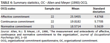 Lok and Crawford (2004:324) have suggested that the success of an organisation depends on the level of involvement and commitment of employees. There are different typologies of OC (Becker 1960; Kanter 1968; Mowday et al. 1979). For the purpose of this study, the typology of Allen and Meyer (1990) is used because it is a reliable and valid research instrument that has been widely applied. There are three OC profiles, namely affective, normative and continuance profiles (Meyer et al. 2002). Although each commitment profile represents a relationship between organisation and employee, the relationships differ from each other in nature. Whilst there are differences in nature between these commitment profiles, the multidimensional nature of each profile also 'integrates attitudinal and behavioural approaches' (Van Dyk & Coetzee 2012:3).
