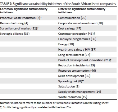 Secondly, an online search for each company's SR was performed. Although South African companies are not yet obliged to present a separate SR, most have these already in place; therefore, these reports were used in the research study. Thirdly, quantitative content analyses of the SRs were carried out based on the variables used by Montabon et al. (2007). Montabon et al. (2007) identified the following sustainable development initiatives (divided into four broad categories): Operational (recycling, waste reduction proactive, waste reduction reactive, remanufacturing, substitution, consume internally, packaging, spreading risk, market for waste, energy, money spent on environment, environmental information and rewards); Tactical (supply chain management, early supplier involvement; environmental standard for suppliers, environmental audits of suppliers, environmental awards/recognition, environmental participation, use of life cycle analysis or design for environment, product development and innovation, design, specific design targets, environmental risk analysis, environmental management systems and communication with stakeholders as to the environmental impacts of the company on the environment); Strategic (integration with long-term business strategy, corporate policies and procedures, environmental mission statement, employee programmes, environmental department/teams, surveillance of the market for environmental issues and strategic alliances); Performance measures (reduction in significant environmental incidents, environmental certification, continuous improvement, recycling performance, customer and shareholder perception of environmental performance, independent audits of environmental performance, waste reduction, resource consumption, cost savings for environmental projects and activities, ROAs, return on investments, operating earnings, sales growth, innovation performance of products and innovation performance of processes).
