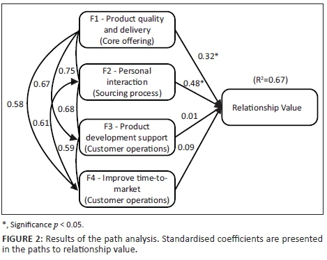 The results indicate that product quality and delivery (F1) and personal interaction (F2) have the strongest direct effects on RV (β = 0.32 for F1 and β = 0.48 for F2, p < 0.05). However, product development support (F3) and improved time-to-market (F4) do not appear to significantly influence RV directly (β = 0.01 for F3 and β = 0.09 for F4, p < 0.05), suggesting that these variables may be mediated by F1 and F2. The R-square measure indicates that 67% of the variance in RV can be explained by the model (Figure 2). The correlational relationships between the independent variables (left on Figure 2) revealed acceptable discriminant validity (r < 0.90) (Pallant 2011:151) and suggested sufficient independence between factors.