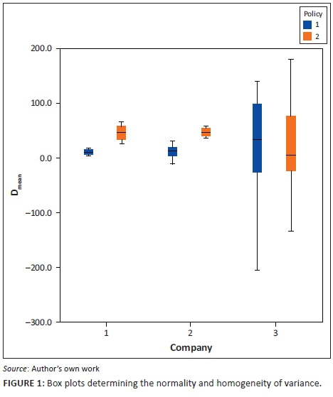 This section analyses data using factorial designs. It incorporates box plots to determine whether the factorial ANOVA assumptions of normality and homogeneity of variance have been met. Porkess (2005) explains that the populations represented should be normally distributed (i.e. the normality), making the mean an appropriate measure of central tendency. However, the homogeneity of variance indicates that the population from which the data are sampled should have the same variance. In this study, 'policy 1' is the pre-dummy period, whereas 'policy 2' is the post-dummy. Figure 1 represents the box plots for this study.