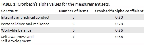 CONTRIBUTION/VALUE-ADD: No previous studies could be found investigating the relationship between integrity and ethical conduct, and between personal drive and resilience, as well as between work-life balance on the one hand and self-awareness and self-development on the other.