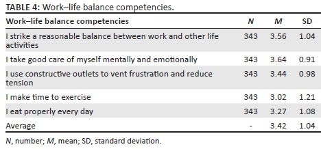 = 4.13. The item 'I pursue my career/business goals in a balanced way' obtained a score of