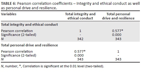 Table 6 depicts a p-value of 0.000. It was therefore found to be smaller than 0.05, illustrating a statistically significant relation (Pallant 2010:134). Hence, a significant relation exists between managers' integrity and ethical conduct as well as between personal drive and resilience - all of which are components of their self-management competency. The Pearson correlation coefficient (r = 0.577) is larger than 0.5 and smaller than 1.0, which means that a strong and positive relation exists between managers' integrity and ethical conduct as well as between their personal drive and resilience (Pallant 2010:128). Hypothesis 1 can therefore be accepted.