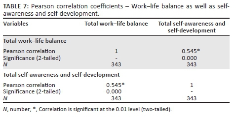 Regarding hypothesis 2, namely that a significant and positive relation exists between managers' work-life balance on the one hand and self-awareness and self-development on the other - all of which are components of their self-management competency, the results obtained are as follows: The p-value (0.00) in Table 7 is smaller than 0.05, representing a statistically significant relation (Pallant 2010:134). Therefore, a significant relation exists between managers' work-life balance on the one hand and self-awareness and self-development on the other - all of which are components of their self-management competency. The Pearson correlation coefficient (r = 0.55) is larger than 0.5 and smaller than 1.0, which indicates a strong and positive relation between managers' work-life balance on the one hand and self-awareness and self-development on the other - all of which are components of their self-management competency (Pallant 2010:128). Hypothesis 2 can therefore be accepted.
