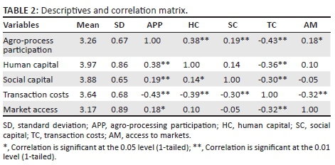 Pearson product-moment correlations coefficients were calculated for each of the scales and are reported with levels of significance denoted in Table 2. The correlation matrix indicates that participation of small-scale agripreneurs was significantly and positively correlated with human capital (r = 0.38; R2 = 0.14; p < 0.01), social capital (r = 0.19; R2 = 0.04; p < 0.05) and market access (r = 0.18; R2 = 0.03; p < 0.05), but significantly and negatively correlated with transaction costs (r = -0.43; p < 0.01).