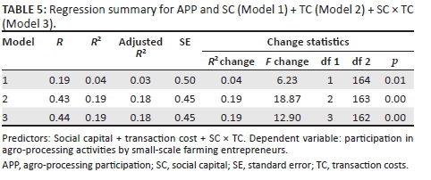 Hypothesis 2 predicted that participation by small-scale agripreneurs in agro-processing activities is positively related to social capital, where this relationship is moderated by transaction costs such that when transaction costs are high, there is a negative relationship, but when transaction costs are low, the relationship is positive. Table 5 shows the regression summary for each of the models formulated to reflect the various predictors.