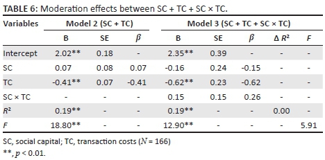 The assessment of the moderation effect via hierarchical regression in H1 is shown in Table 6. R2 for Models 2 and 3 was constant at 0.19 to 0.19 indicating a null differential, albeit statistically significant at the p < 0.01 level. Based on the statistically significant results, H2 is supported, albeit limited variance is explained by SC and TC interactions.
