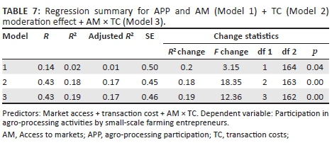 Hypothesis 3 predicted that participation by small-scale agripreneurs in agro-processing activities is positively related to market access, where this relationship is moderated by transaction costs such that when transaction costs are high, there is a negative relationship, but when transaction costs are low, the relationship is positive. Table 7 shows the regression summary for each of models formulated to reflect the various predictors.