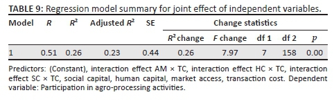 To examine the joint effects of all three of the IVs, a regression model summary was conducted. The results are displayed in Table 9, where a significant R2 = 0.26 (p < 0.00) was obtained meaning that 26% variance in participation by small-scale agripreneurs was explained by the IV variables jointly. Considering that the R2 was significant with F (7158 = 7.97, p = 0.00), the effect size was classified as moderate.
