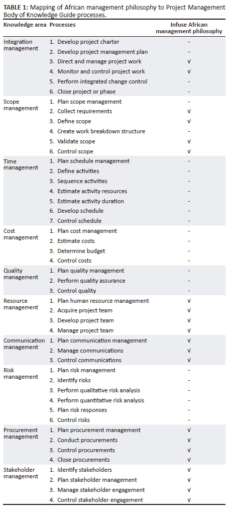 The lack of research on the role that African management philosophy (AMP) can play within the project management discipline creates an opportunity for scholars. At present, project management and the philosophies around it are informed by Western management philosophy (WMP). Western management philosophy in project management is evident in formal standards and practices such as Project Management Body of Knowledge (PMBOK), Association for Project Management Body of Knowledge (APMBOK) and PRojects IN Controlled Environments 2 (PRINCE2) (Association for Project Management 2012; Office of Government Commerce 2009; Project Management Institute 2013). This raises the question whether African and for that matter other non-Western philosophies can be introduced into the project management discipline. It also raises the question whether AMP has been subconsciously applied in the management of projects. This article takes a philosophical approach to the problems raised and seeks to understand how AMP can be incorporated into project management. The focus is not to replace WMP, but to determine how African and Western philosophies can be infused into project management. Project managers can draw from a wealth of knowledge when these two seemingly contradicting management philosophies are infused into each other.