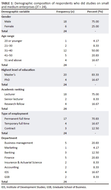 For quantitative data, the exercise started off with the cleaning of the data for completeness and usability. All the questionnaires were found to be suitable for analysis. Quantitative data were then analysed through frequencies and percentages with the use of the Statistical Package for Social Sciences (SPSS) and presentation was in the form of tables. Cross tabulations between demographic variables and questions specifically related to non-disseminated data were conducted to find out if there were relationships. Pearson chi-square tests were also performed to establish whether there were any significant relationships between demographic variables and selected questions at 0.05 level of significance. For the qualitative part of the study, data were analysed according to themes which emerged after the data had been labelled and grouped according to similarities. The emerging themes were then interpreted in the context of the objectives of the study. Direct quotations were also used to present this data. In this study, the terms respondents, academics, lecturers and participants were used interchangeably. From the 81.25% collected questionnaires, only 36.92% had conducted studies on SMEs, while the remaining 63.08% had conducted other studies not related to SMEs. Out of the 36.92% of the respondents who had conducted studies on SMEs, 41.67% had not disseminated their results and these are the respondents who formed the basis of this study.