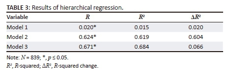 The statistical analysis was carried out with the help of the Statistical Package for Social Sciences (SPSS), version 25 for Windows software (2018). Descriptive statistics, correlations and hierarchical multiple regressions were employed for data analysis. Correlational analysis was utilised to investigate the relationship between EWC and ELB as the independent variables, and WE as the dependent variable. In terms of statistical significance, it was decided to set a cut-off value at the 95% confidence level (p 0.05). Hierarchical multiple regression analyses were performed to determine whether or not EWC and ELB acted as significant predictors of the UWES variables. For the purpose of this study, R2 values larger than 0.13 (medium effect) at p 0.05 (Cohen 1992:155-156) were regarded as practically significant. Prior to conducting the various regression analyses, Harman's single-factor test was performed to ensure the absence of common method bias (using the cut-off point of eigenvalue = 1; σ 50). Collinearity diagnostics was examined to ensure that the zero-order correlations were below the level of concern (r 0.90), that the variance inflation factors did not exceed 10 and that the tolerance values were close to 1.0 (Hair et al. 2010:93-149).