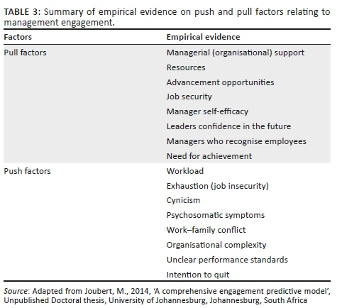 In the case of management engagement, both the identified pull and push factors that may have an impact on management engagement are identified in the following published research: Burke and El-Kot (2010); Flynn (2007); Furness (2008); Holland, Cooper and Sheenan (2017); Jena Lalatendu, Pradhan and Pranigrahy (2018); Lee et al. (2017); Luthans and Petersen (2002); Rothmann and Joubert (2007); Wiley, Kowske and Herman (2011); and Xu, Liu and Chung (2017). Joubert (2014:101) also listed such push and pull factors (beyond those reported in the JD-R model) that are related to team engagement in Table 3.