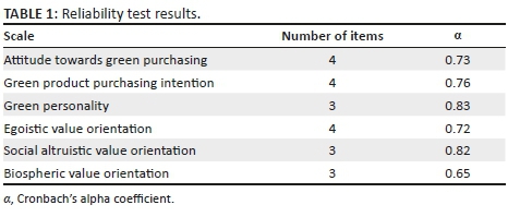 Cronbach's alpha coefficients were calculated for the following variables: green attitude, personality, values and purchasing intention. The Cronbach's alpha coefficient was evaluated using the guidelines suggested by George and Mallery (2016), where > 0.9 is excellent, > 0.8 is good, > 0.7 is acceptable, > 0.6 is questionable, > 0.5 is poor and ≤ 0.5 is unacceptable. Table 1 presents the results of the reliability analysis.