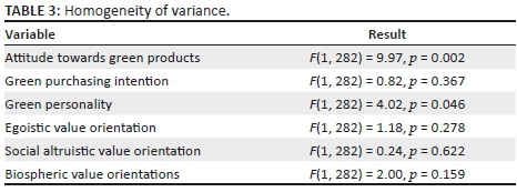 With respect to green values, non-significant differences across gender groups were observed for egoistic and biospheric value orientations. This was quite unexpected as literature on gender and consumption insinuates that men are generally more conceited and spendthrift in their conduct than women (Meyers-Levey & Loken 2015; Nguyen et al. 2017). However, significant differences were noted for the social altruistic value orientation variable. Contrary to the common position in the literature that women are more benevolent and socially oriented than men (Betzig 2018; Rand et al. 2016), the current study proved otherwise, with male respondents scoring a higher mean value than female respondents. The explanation for this difference is not clear given that the current study is exploratory in nature.