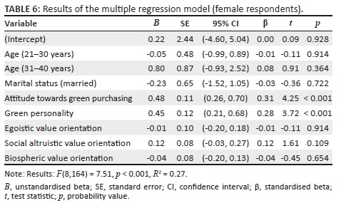 Another multiple regression analysis was performed in order to test whether a selected set of predictors had a significant influence on green purchasing intention among female college students. The regression model incorporated predictor variables similar to those employed in the model for male respondents, and its result was significant (F[8,164] = 7.51, p < 0.001, R2 = 0.27). This means that approximately 27% of the variance in green purchasing intention can be explained by the said predictor variables. Of the predictor variables, age, marital status, egoistic value orientation, social altruistic value orientation and biospheric value orientation had a statistically non-significant influence as reflected by the p-values, which are greater than 0.05. On the other hand, attitude towards green products and green personality had significant effects as shown by the following statistics: attitude towards green products (B = 0.48, t[164] = 4.25, p < 0.001) and green personality (B = 0.45, t[164] = 3.72, p < 0.001). Table 6 summarises the results of the regression model.