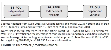 To explore the constructs of the business events tourists' intention to accept online technology model, hypotheses were formulated and tested using a three-step process. Firstly, the theoretical model was developed to depict the relationships among perceived usefulness, PEU and online intention to use. Secondly, the model was benchmarked with similar online models. This resulted in three measuring instruments: the perceived usefulness of online technology, perceived ease of use of online technology, and intention to use online technology, which were included in the construction of the final instrument. The BT_POU Scale (Acarli & Saglam 2015; Ayeh 2015; Herrero & Martin 2012; Huang et al. 2013; Jongchul & Sung-Joon 2014), the BT_PEOU Scale (Acarli & Saglam 2015; Ayeh 2015; Herrero & Martin 2012; Huang et al. 2013; Jongchul & Sung-Joon 2014) and the BT_OIU Scale (Acarli & Saglam 2015) consisted each of four items.