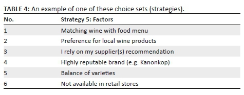 The respondents were provided with 11 factors that were also representative of the strategies that could be considered when compiling a wine list. These strategies, in turn, each consisted of a choice set of six factors. Table 2 contains all 11 factors from which the respondents could choose to create a strategy.