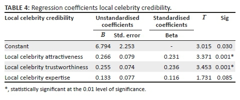 The data were then analysed using multiple regression analysis, which calculates the causal effect between independent variables and a dependent variable (Babbie 2016). In the current study, (r) was used to calculate the extent to which the independent variables (attractiveness, trustworthiness and expertise) predicted the intention to purchase cosmetic products advertised by either local or international celebrity endorsers. If a strong relationship was observed between the indicators, it meant that there was a clear positive relationship between the independent variables and the dependent variable. R2 is regarded as the coefficient of determination and showed how much of the variance in the dependent variable was explained by each independent variable (Hanneman & Riddle 2011). In the current study, R2 was used to calculate the extent to which attractiveness, trustworthiness and expertise explained the variance in consumer's intention to purchase.
