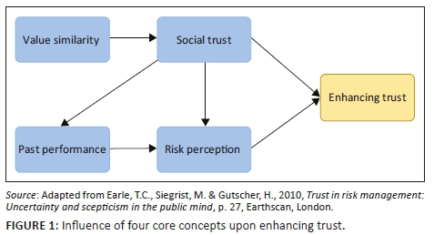 Organisational trust is a combination of trust relationships between individuals (Yan et al. 2014:121). Because human beings are socially interactive creatures, a strong building block of trust is the social interaction between individuals of different organisations, such as dining together, playing golf or other sport and even joint leisure activities (Meyer et al. 2017:7). Social trust is influenced only by value similarity (Earle et al. 2010:27). Figure 1 illustrates what role each of the four concepts has in enhancing trust.